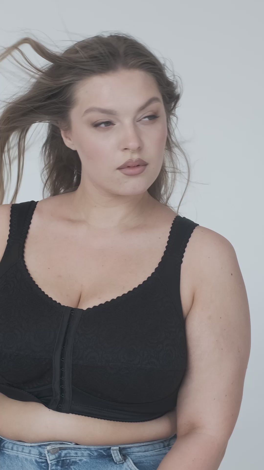 Ši priekyje susegama itin stabili liemenėlė be lankelių yra idealus pasirinkimas moterims, turinčioms didesnę krūtinę. Speciali nugarinės dalies konstrukcija padeda išlaikyti tiesesnę nugarą, ji mažiau pavargsta. Aukšti T konstrukcijos kaušeliai sukuria švelniai smailėjantį krūtinės siluetą. Kaušeliai papuošti nėriniais, papildomai sutvirtinti plonu medvilniniu pamušalu. Plačios, paminkštintos petnešėlės suteikia patogumo, neįsirėžia, nespaudžia ir puikai prilaiko didesnę krūtinę.