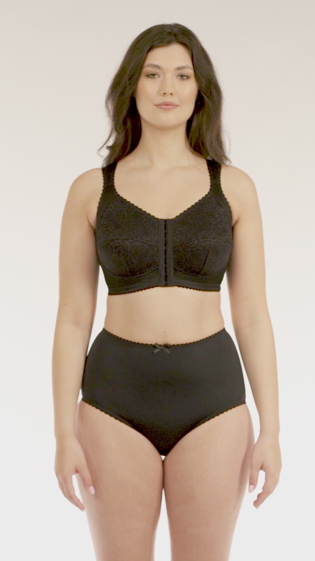Ši priekyje susegama itin stabili liemenėlė be lankelių yra idealus pasirinkimas moterims, turinčioms didesnę krūtinę. Speciali nugarinės dalies konstrukcija padeda išlaikyti tiesesnę nugarą, ji mažiau pavargsta. Aukšti T konstrukcijos kaušeliai sukuria švelniai smailėjantį krūtinės siluetą. Kaušeliai papuošti nėriniais, papildomai sutvirtinti plonu medvilniniu pamušalu. Plačios, paminkštintos petnešėlės suteikia patogumo, neįsirėžia, nespaudžia ir puikai prilaiko didesnę krūtinę.