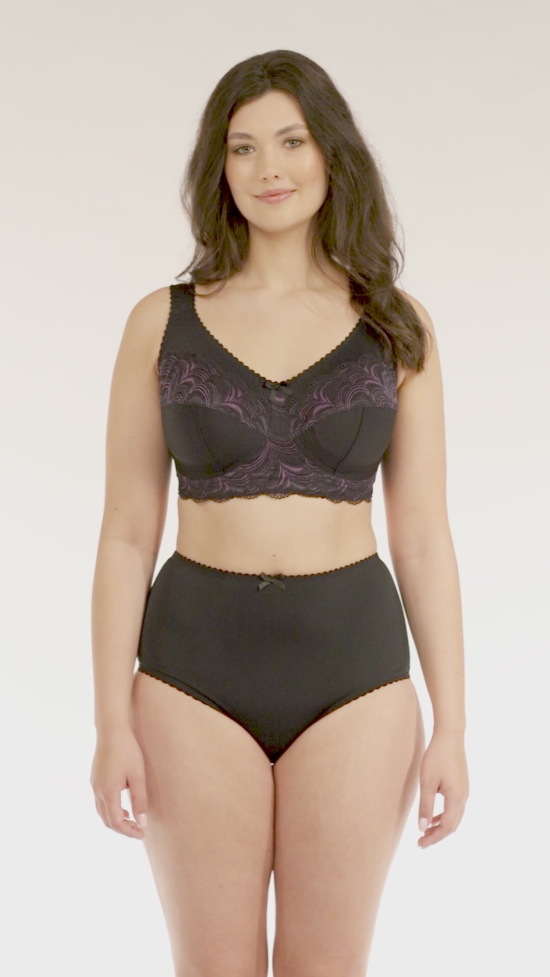 Elegantiška liemenėlė be lankelių. Uždara liemenėlės konstrukcija puikiai prilaiko. T konstrukcijos kaušeliai papildomai sutvirtinti medvilniniu pamušalu. Viduryje mažas atlasinis kaspinėlis. Plačios, paminkštintos, reguliuojamo ilgio petnešėlės itin patogios, neįsirėžia, nespaudžia ir puikai prilaiko didesnį krūtinės svorį.